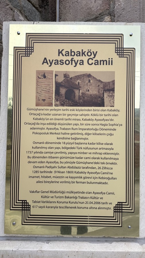 Orta çağda yapıldığı değerlendirilen ve Hagia Sophia’ya adanan kilise Trabzon Rum İmparatorluğu döneminde piskoposluk merkezi haline getirildi. 18. yüzyıl başlarına kadar kilise olarak kullanılan yapı bölgedeki Türk nüfusunun artmasıyla 1737 yılında camiye çevrildi. Osmanlı Padişahı Sultan Abdulaziz tarafından Kabaköy Ayasofya camiine imam ve görevli tayini için verilmiş bir berat bulunan cami, dikdörtgen planlı, 3 nefli, 3 apsisli bir yapıya sahip. İçerisinde devasa sütunların yer aldığı, dış duvarlarında kilise olduğu döneme ait süslemelerin bulunduğu cami 1972 ve 2010 yıllarında iki kez restore edildi.